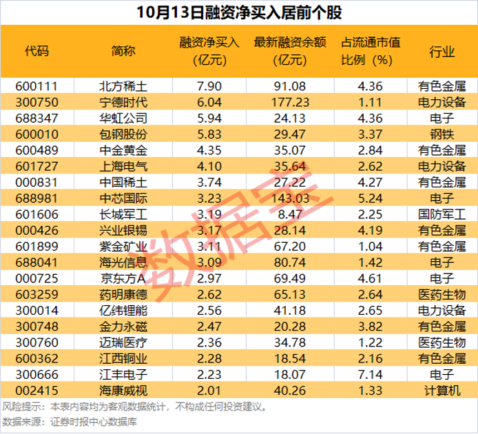 具体到个股,10月13日获融资净买入在1亿元以上的有42只,其中,4股融资净买入额均超5亿元。