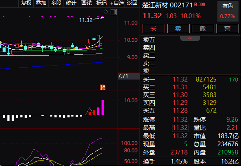 以预计净利润增幅上限统计,共11股预计净利润增幅超100%,楚江新材预计前三季度净利润同比增长2242.56%,增幅居首。股价表现方面,楚江新材今日“一字”涨停,涨停板封单资金近83万手。